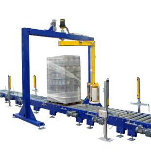 vollautomatischem Deckblattaufleger vor dem Stretchfolienwickler (Folienüberlappung frei wählbar). Mit doppelten Dreharmen, die gleichzeitig die Palette einwickeln. Die Fakten: